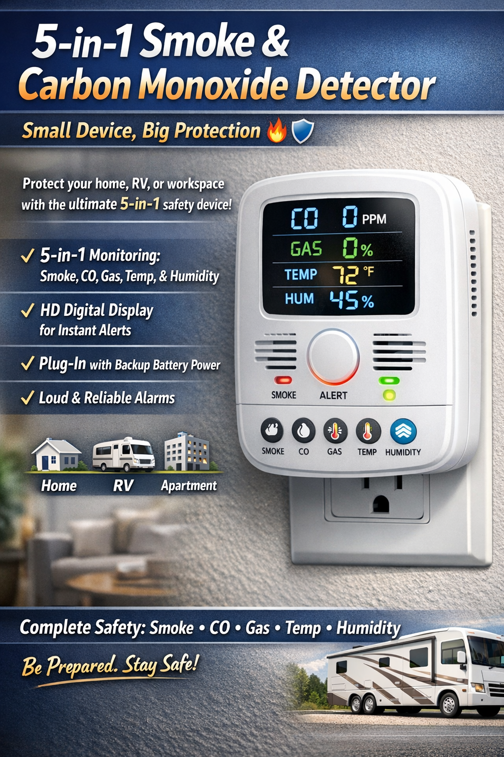Protect your home, RV, or workspace with this smart 5-in-1 Smoke & Carbon Monoxide Detector—a compact safety powerhouse designed for modern living. It doesn’t just alert you to danger; it keeps you informed in real time.