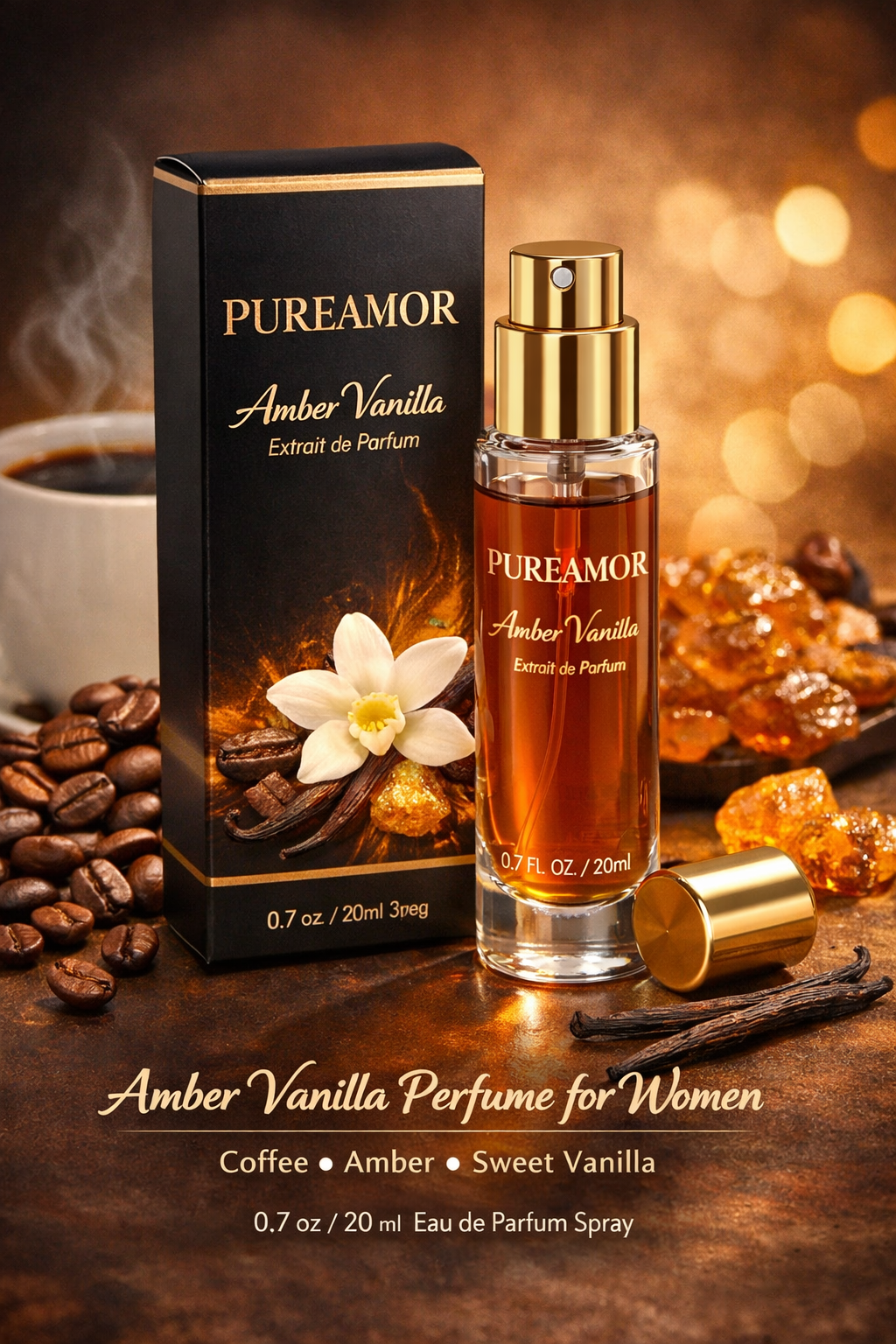 PUREAMOR Amber Vanilla Perfume for Women blends rich coffee notes with glowing amber and sweet vanilla, creating a fragrance that’s both comforting and confidently alluring. This long-lasting extrait de perfume offers deep intensity with every spray, while the sleek 0.7 oz travel size makes it perfect for everyday luxury—anytime, anywhere.
